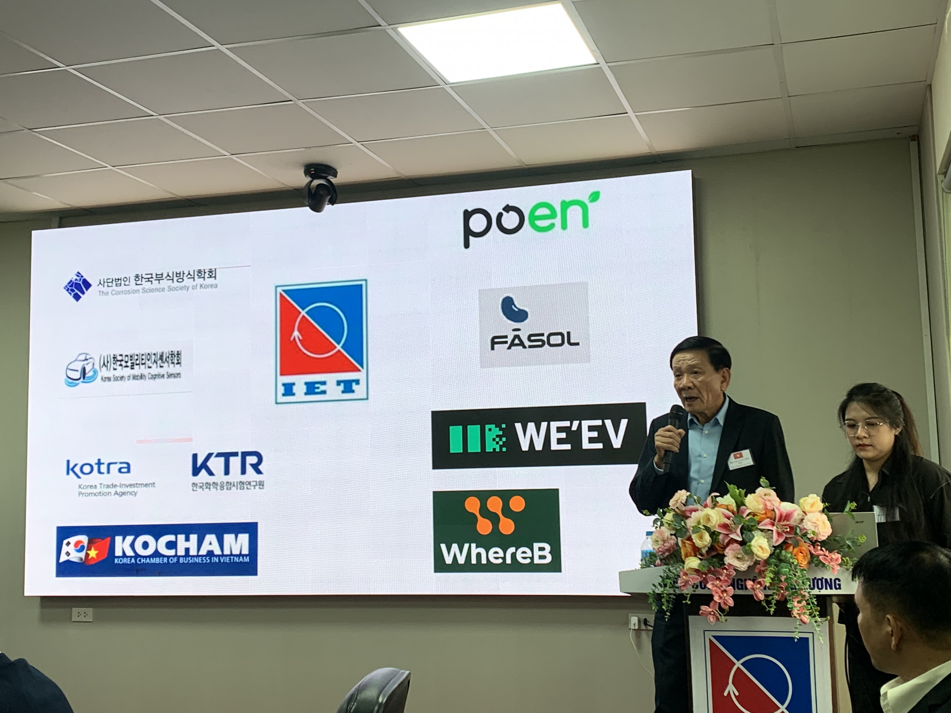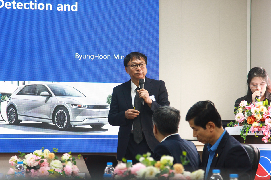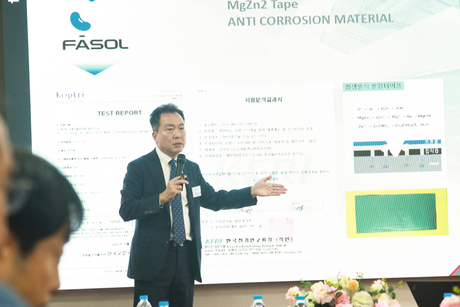 Ông Lee Sang-Hoon - Tổng giám đốc Smart Factory ( FASOL) giới thiệu định hướng hợp tác tại Việt Nam, tập trung 2 trụ cột: (1) nhóm giải pháp FA Solution gồm AI, Robotics, Recycling Battery và Inverter HYOSUNG; (2) mảng vật liệu mới chống ăn mòn với MgZn₂ dạng bột (<10 µm) và dạng tape phục vụ bảo vệ bề mặt/thiết bị.